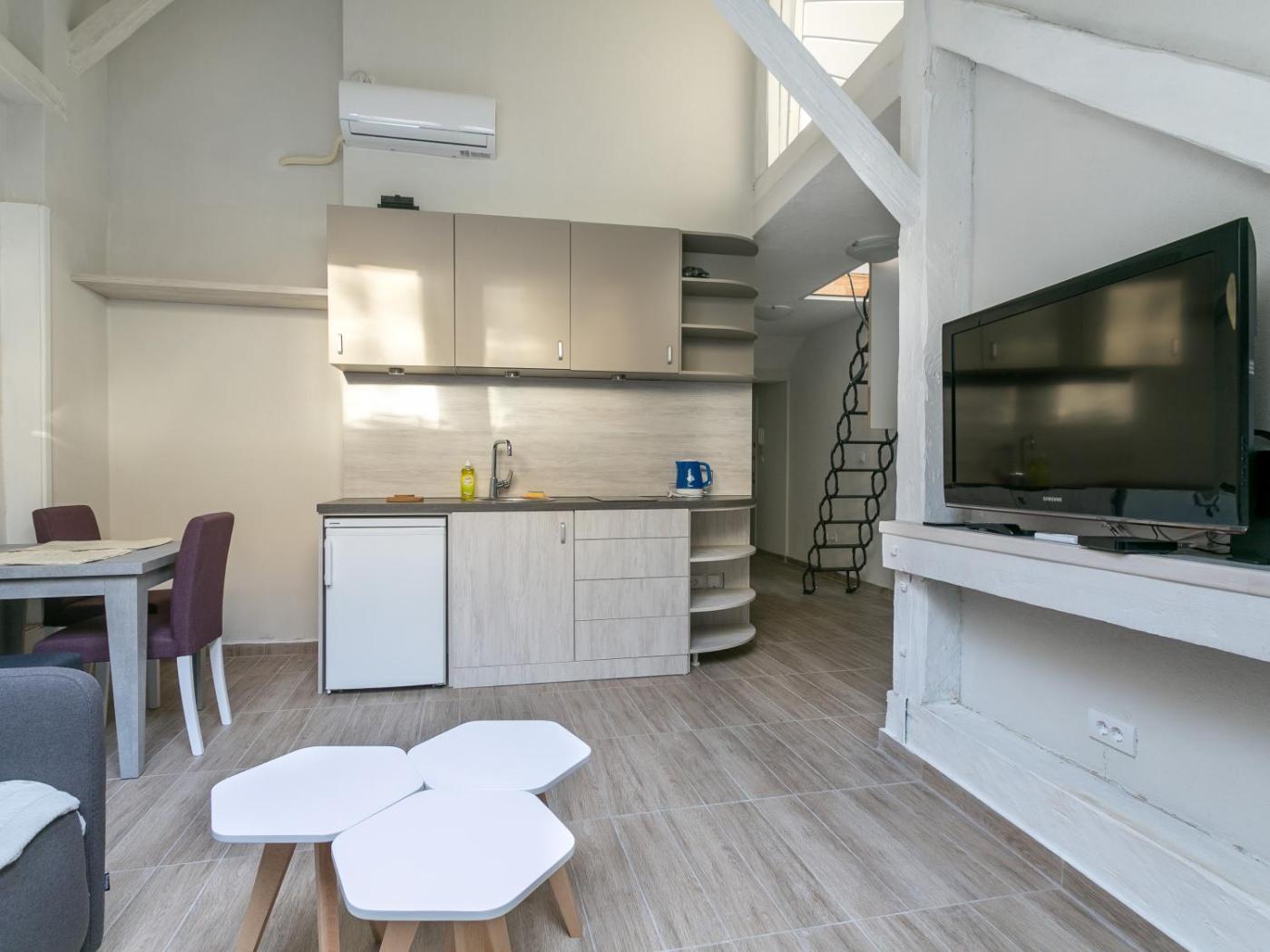 One-Bedroom Apartment. Featuring a private entrance, this air-conditioned apartment consists of 1 living room, 1 separate bedroom and 1 bathroom with a bath and a shower. Guests can make meals in the fully equipped kitchen that features a refrigerator, kitchenware and an oven. The apartment provides a flat-screen TV with cable channels, a dining area, a wardrobe, an electric kettle as well as city views. The unit offers 2 beds.