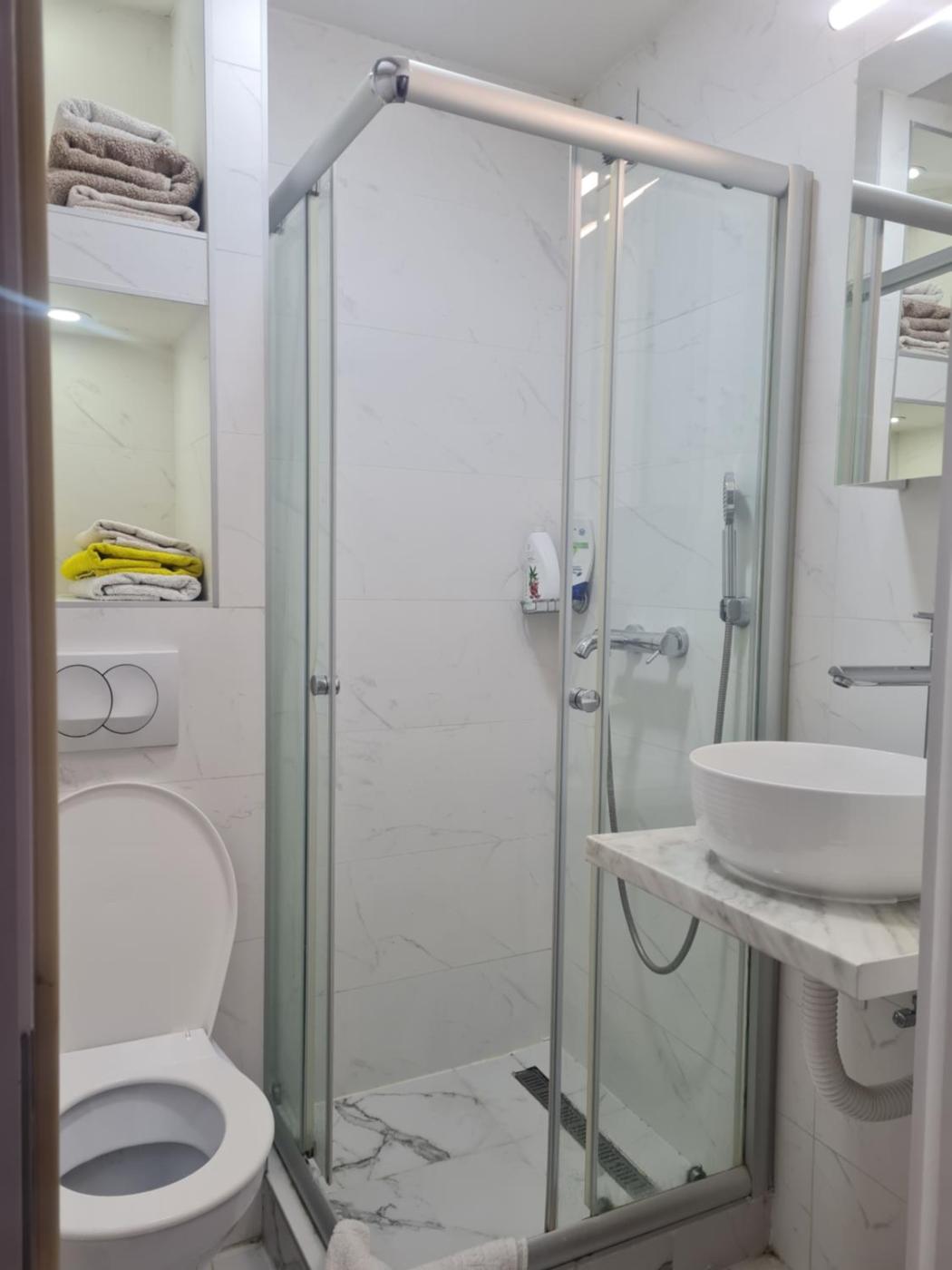 One-Bedroom Apartment. Boasting a private entrance, this air-conditioned apartment includes 1 living room, 1 separate bedroom and 1 bathroom with a walk-in shower and a hairdryer. In the kitchen, guests will find a refrigerator, kitchenware and an electric kettle. The apartment has tiled floors, a seating area with a flat-screen TV, a washing machine, a dining area as well as city views. The unit has 3 beds.
