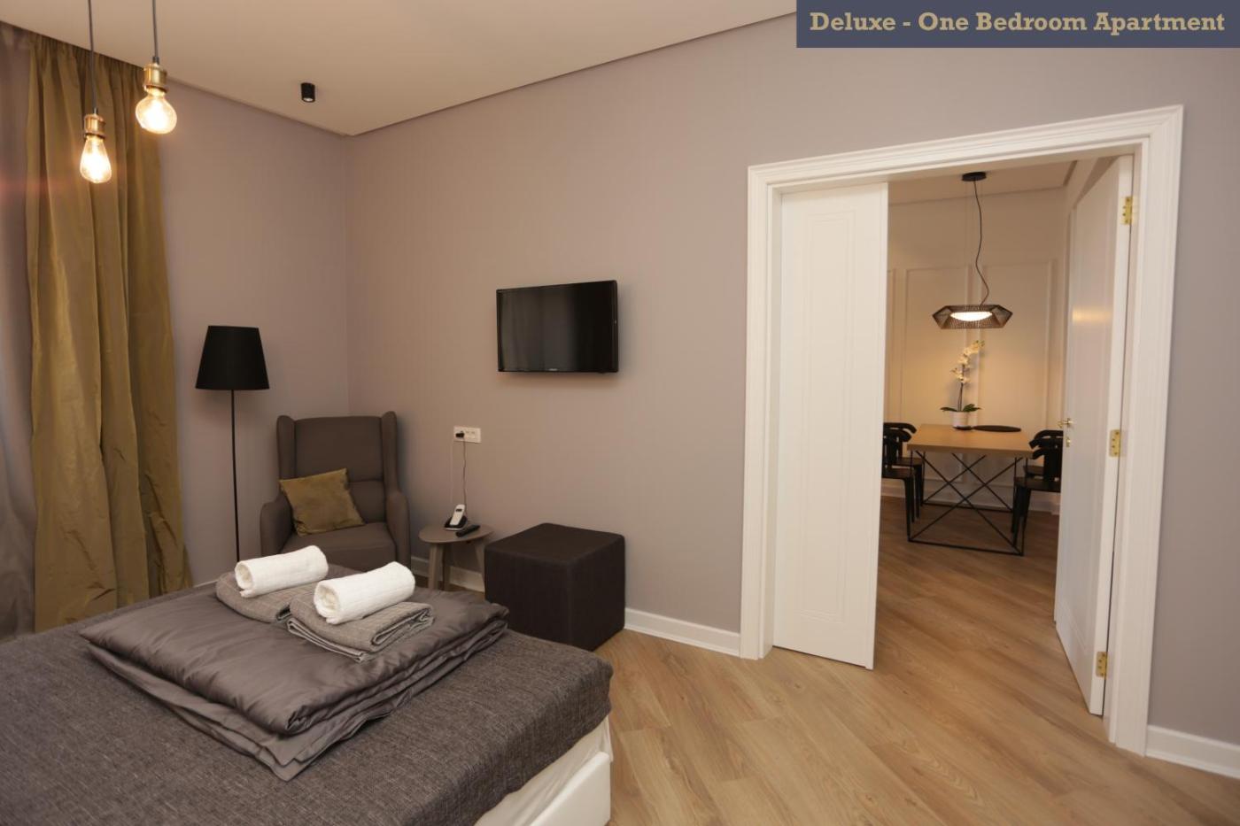Deluxe One-Bedroom Apartment. Boasting a private entrance, this air-conditioned apartment includes 1 living room, 1 separate bedroom and 1 bathroom with a walk-in shower and a hairdryer. In the kitchen, guests will find a stovetop, a refrigerator, kitchenware and an oven. Featuring a terrace with city views, this apartment also offers soundproof walls and a flat-screen TV with cable channels. The unit has 2 beds. ;